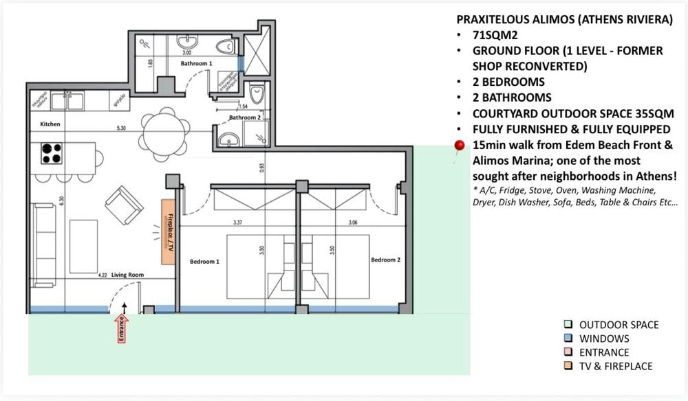 Discover a rare opportunity to own a 71 m² ground-floor apartment in Alimos, located in one of the most sought-after areas of the Athenian Riviera. Originally a shop, the property has been professionally converted into a residence (Golden Visa Eligible), offering a modern layout with 2 bedrooms and 2 bathrooms. The apartment will be delivered fully furnished and fully equipped, featuring an open-plan living area, contemporary kitchen, air conditioning, and quality appliances including fridge, stove, oven, washing machine, dryer, and dishwasher. A key highlight is the private 35 m² courtyard, ideal for outdoor living. Just a 15-minute walk from Edem Beach and Alimos Marina, this property combines coastal lifestyle with strong investment appeal, making it ideal for both personal use and rental income. Estimated delivery: April 2026.